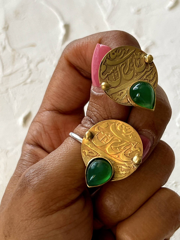 گوشواره دست ساز برنجی سنتی با نگین عقیق سبز اشکی و طرح خطاطی