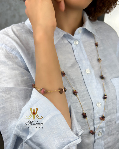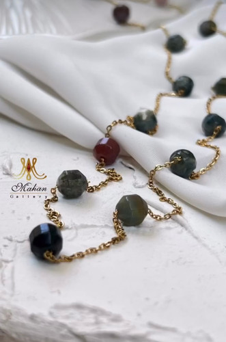 گردنبند رومانتویی بلند با عقیق خزه ای و رودونیت درجه یک استیل طلایی