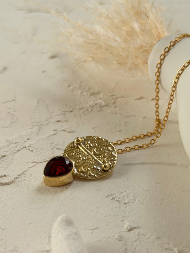 گردنبند سکه ای دستساز با نگین قرمز و زنجیر استیل رنگ ثابت