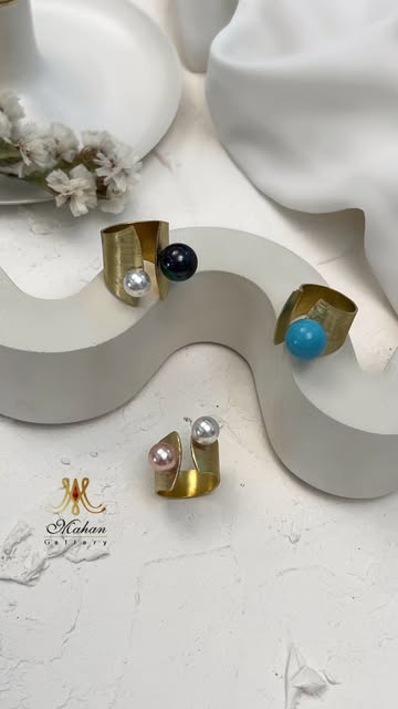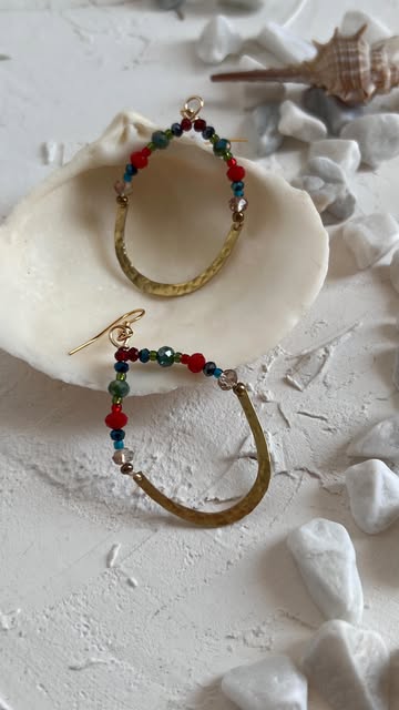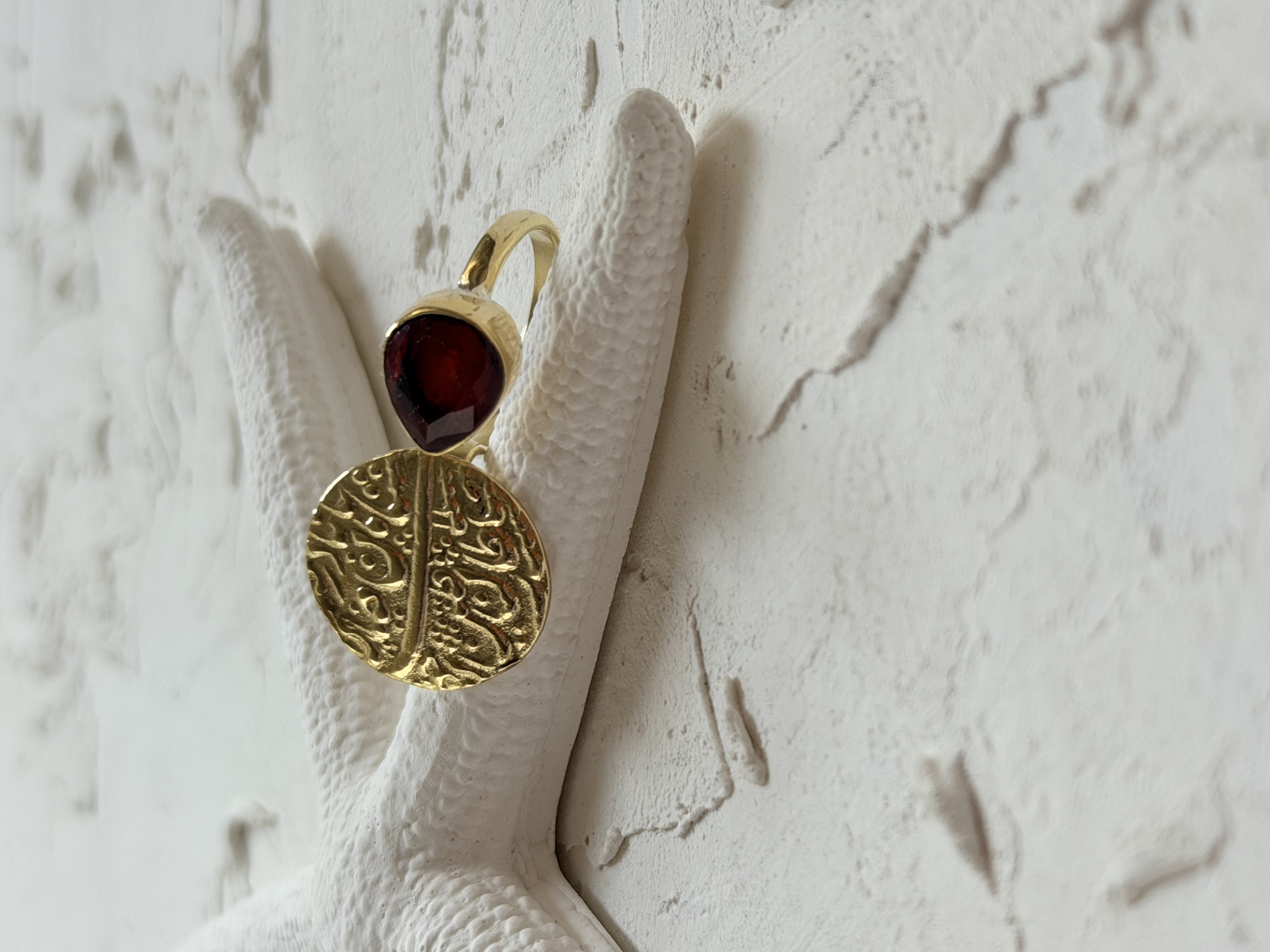 گوشواره حلقهای دست ساز برنجی چکشکاری شده با نگین عقیق واشری و جید قرمز