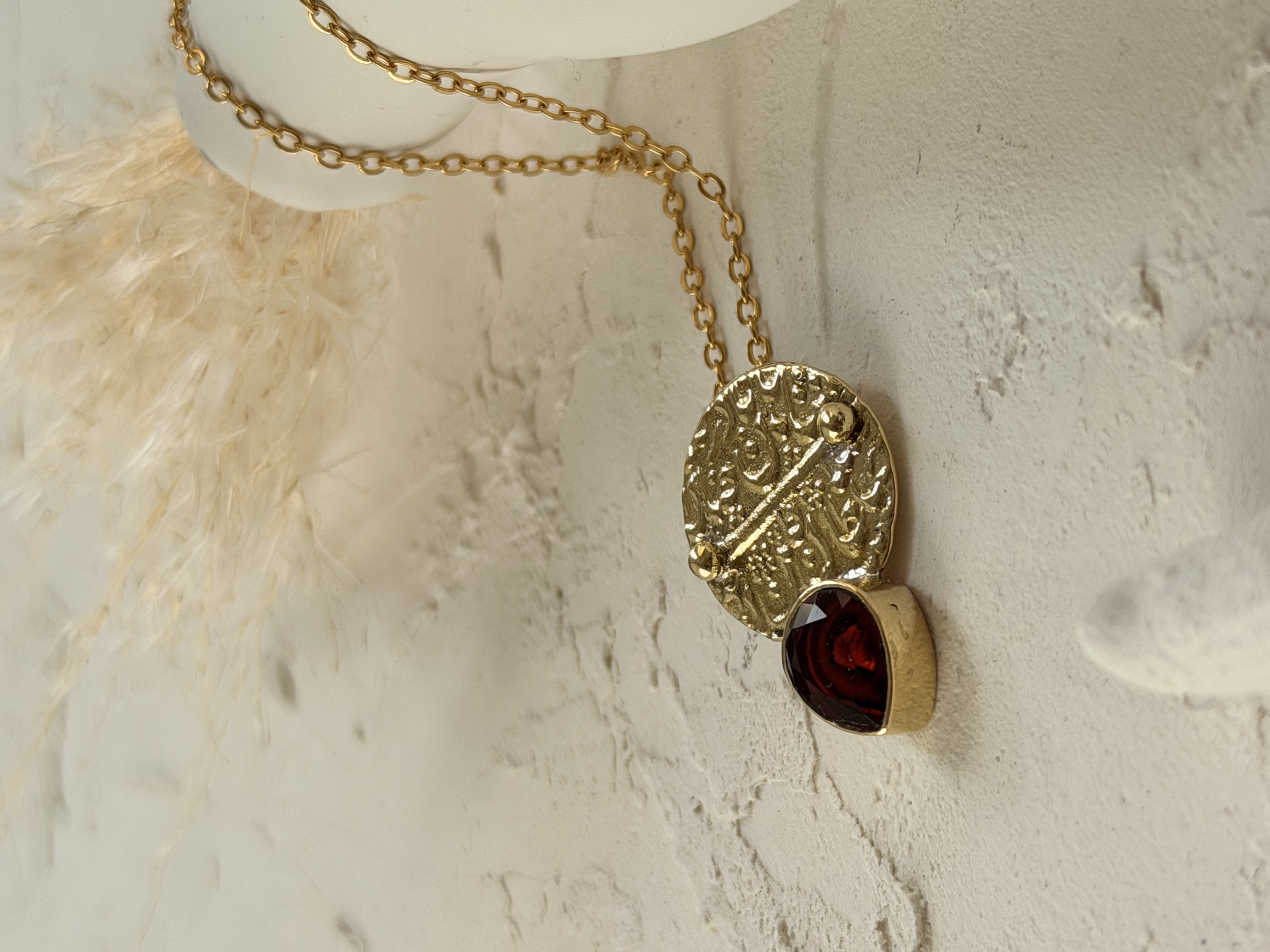 گردنبند سکه ای دستساز با نگین قرمز و زنجیر استیل رنگ ثابت